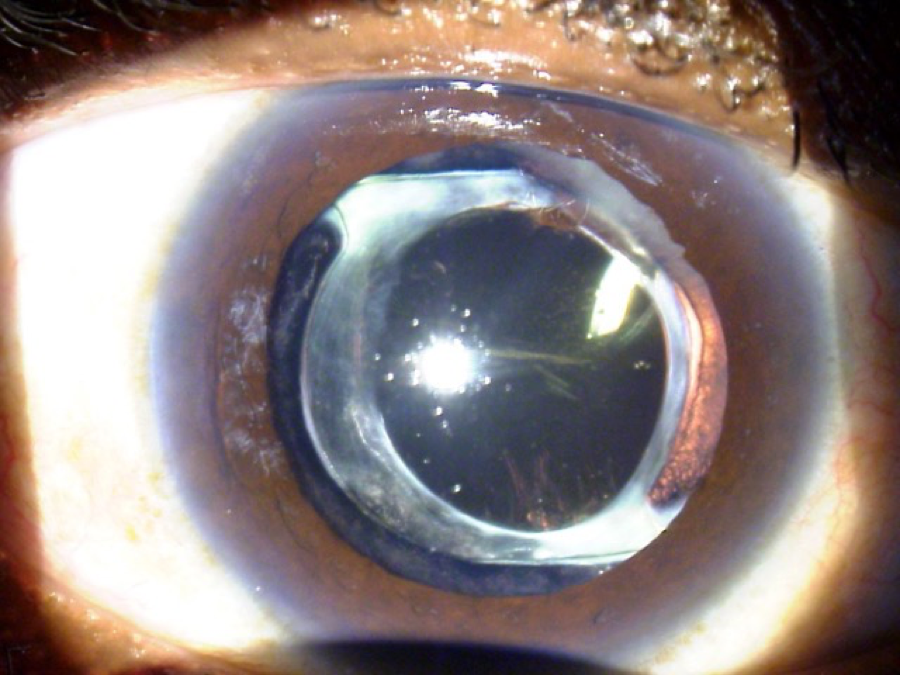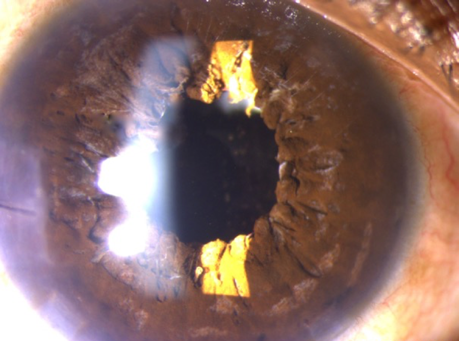 This is a 55-year-old active male who had blunt trauma to the OD. He developed a traumatic cataract and subsequently had cataract surgery. Since the surgery, however, he has been bothered by intractable glare in this, his dominant right eye. He was referred to me for an opinion on what can be done to fix his glare problem. His refractive outcome in this eye is +1.5. The other eye is phakic and plano. On exam the eye has a fixed and dilated pupil. The images included have been taken without dilating drops placed in the eye. His pupil is fixed in this position and does not budge with bright light or pilocarpine. He has an AcrySof lens (Alcon, Fort Worth, Texas) with a series of smudges or scratches centrally, moderate to severe glistenings in the optic, and he had extensive YAG capsulotomy treatment extending almost to the edge of the optic 360 degrees. On gonioscopy it can be seen that there is a diffuse, patchy loss of zonules, mostly associated with his blunt trauma and previous surgery. The patient’s best corrected vision in this OD (his dominant eye) is limited to 20/40 because of the macula damage associated with his trauma. He’s also very bothered by glare and light sensitivity.