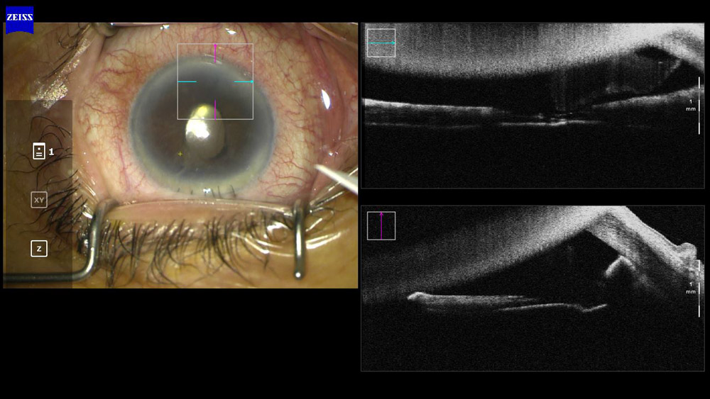 Intraoperative OCT also came to the rescue when a patient was brought back to the OR with a retained nuclear lens fragment. Intraoperative OCT was able to find the fragment in the angle for successful removal (Figure 9).