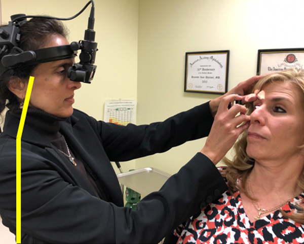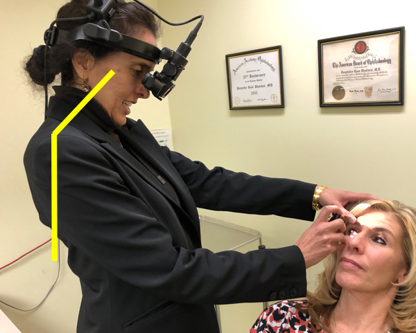 One of the most important things, she said, is to work on having the neck over the shoulders over the hips and having a straight spine. In the office, when Dr. Dhaliwal is at the slit lamp, she has the patient move to the edge of their seat so she can keep her back straight. She then raises the exam chair and rolls her stool under the platform for their feet.