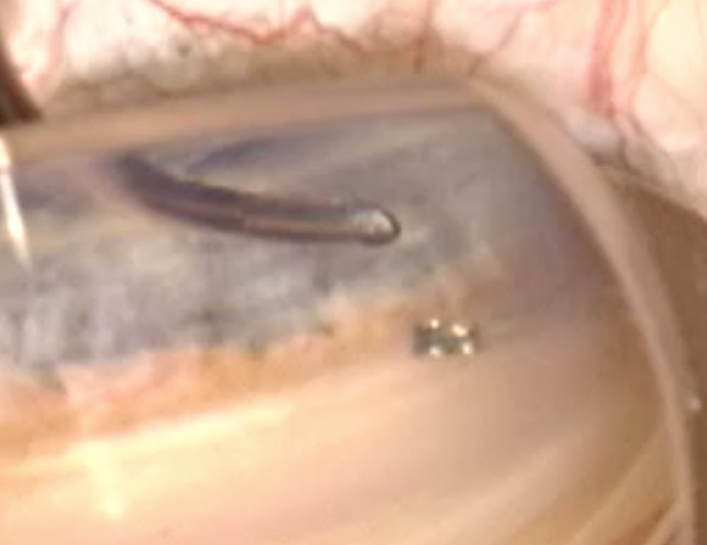 B. Hydrus in place in the canal with adjacent area of goniotomy visible (white area visible is back of Schlemm’s canal)