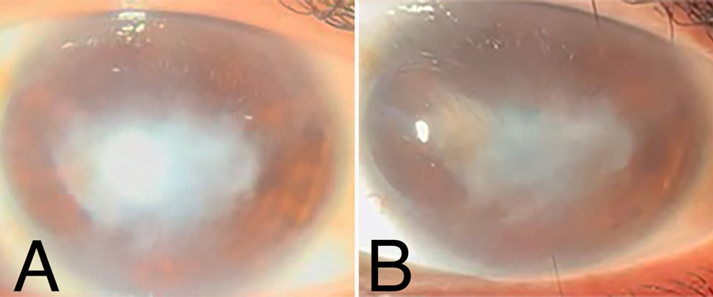 A young contact lens wearer contracted Acanthamoeba keratitis, and topical losartan treatment was used for corneal scarring fibrosis. A. After many months of anti-Acanthamoeba treatment, the infection was cured but the cornea continued to have severe scarring fibrosis. The patient started 0.8 mg/mL losartan in balanced salt solution six times a day. B. After 4 months of treatment with topical losartan, there was a marked decrease in scarring fibrosis. The patient is continuing topical losartan treatment and has experienced no side effects from the treatment.