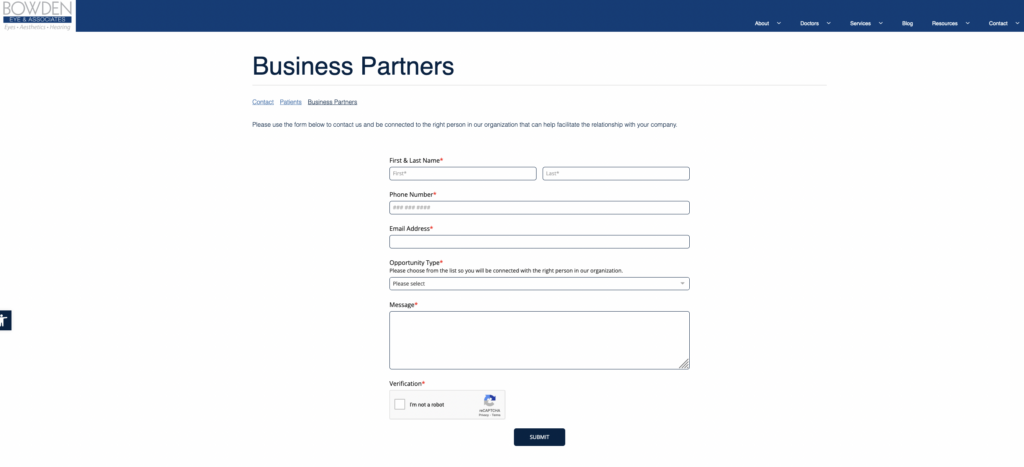 To implement this change, practices should start by reviewing their current contact page to assess how a Business Partners section could be integrated seamlessly. They should then identify key contacts within the practice for various business engagement areas. With this information, they can add the Business Partners Contact dropdown menu, clearly outlining each area with the respective practice contact.