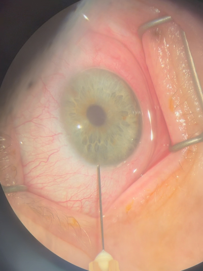 โCells are delivered to the surgeon on the morning of the surgery and drawn up in a syringe. The patient is prepared in a sterile environment, and the cells are injected into the anterior chamber of the eye after the anterior chamber has been decompressed. A suture is placed in the incision site, and the patient immediately turns over to lie face down for 3 hours. They go home after that time has elapsed with a protective shield over the eye.โ