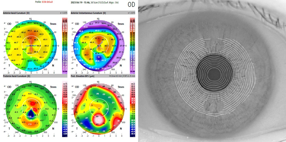 Corneal imaging of an eye with poor vision following implantation of a trifocal lens. Placido mires show subtle distortion just below midline, and irregular astigmatism is evident, particularly in the instantaneous radius of curvature map. A subtle corneal subepithelial scar was evident on slit lamp examination.