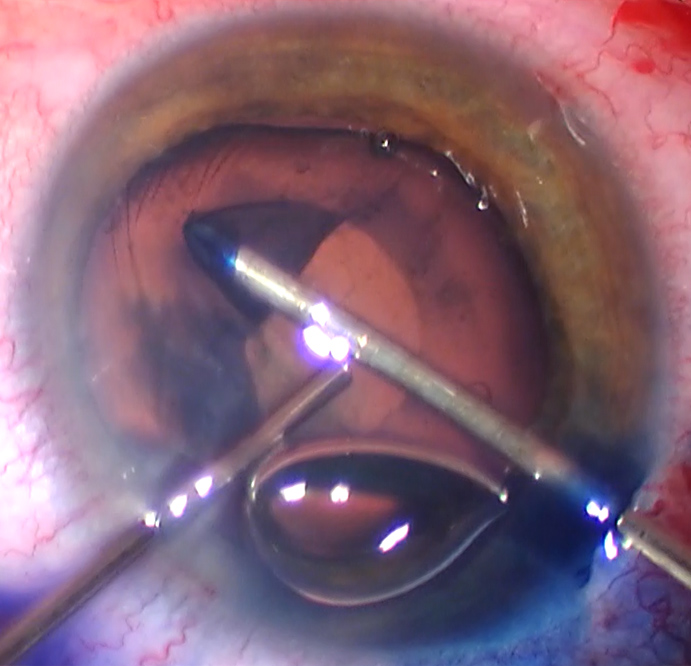 When dealing with more severe zonulopathy, this can make the case trickier, and Dr. Kim said, โmany factors will affect your plan of attack.โ He also suggested first painting the anterior capsule surface with trypan blue because this will aid with capsulorhexis, lens disassembly, and improve visualization for capsule retractor, CTR, and CTS placement. โIf you are unable to perform capsulorhexis, capsule retractors are very helpful,โ he said. โYou want to place the retractor just behind your rhexis flap to provide counterforce.โ